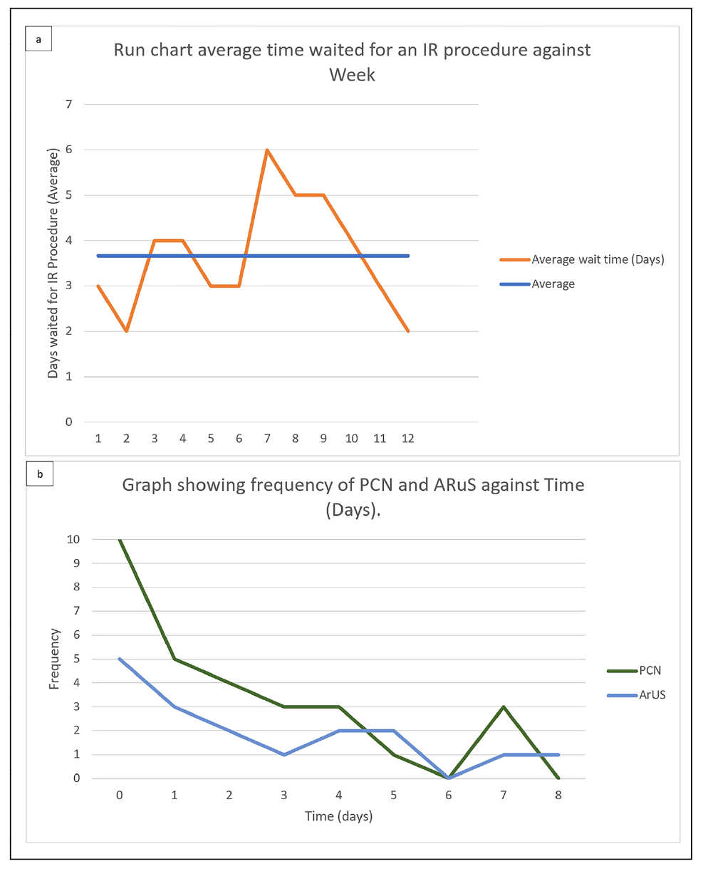 Data was collected over a four-month period. Delay to procedure was the primary measure. There was also an assessment of the opinions of key stakeholders (the urology team and the IR team) and observations to measure time delays at individual stages of processes. As there is no national standard on time to nephrostomy, an internal target was created for these non-life threatening, emergency cases. It was expected that the IR procedures were done on the next available list from time of booking - therefore a target of “less than 3.5 days” was expected.