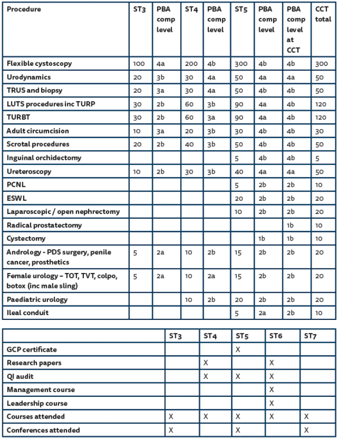 The CCT guidelines have been updated. These include a reduction in indicative numbers for radical prostatectomy and cystectomy and the introduction of ileal conduit. The latter is a transferable skill, obtainable at the time of performing a cystectomy in many cases, and has been introduced to address the needs of emergency surgery skills.