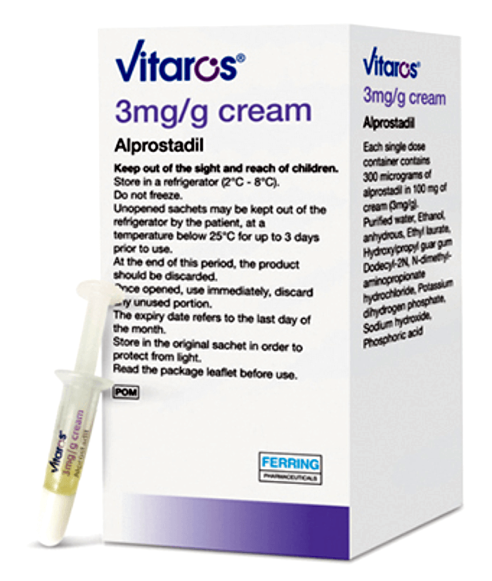 Alternative prostaglandin preparations include MUSE® which is inserted using an applicator into the urethra and massaged into the urethra and glans with a maximum dose of 1000mcg and an efficacy of up to 65%. A newer intraurethral gel called Vitaros® has also been launched in the UK. This uses 300mcg of alprostadil in 100mg of cream and the results have shown a similar response to MUSE® (Figure 2).