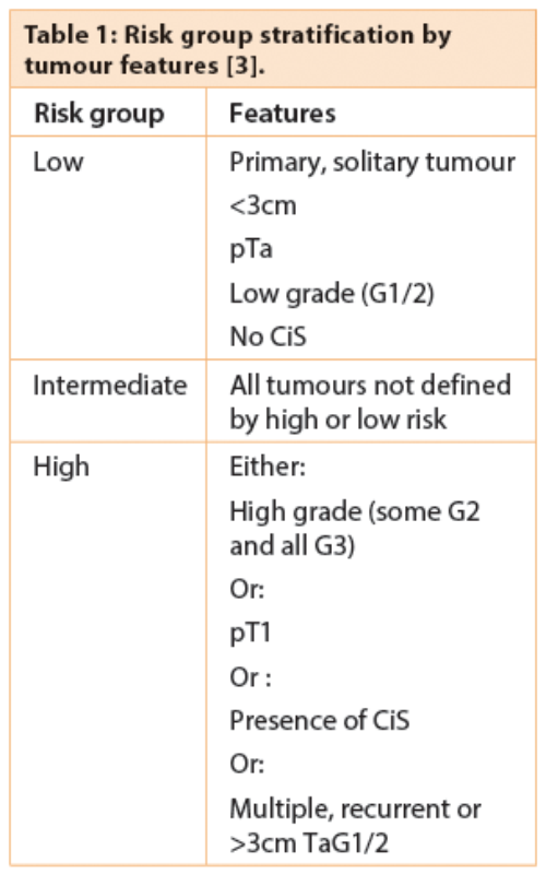 Use of intravesical therapy is guided by risk of progression and recurrence of individual tumours. The European Organization for Research and Treatment of Cancer (EORTC) Genito-Urinary Cancer Group (GUCG) has developed a scoring system and risk tables based on patients diagnosed with stage Ta or T1 tumours. A number of clinical and pathological factors are used to determine the score: number of tumours, tumour size, stage, grade, concurrent carcinoma in situ (CiS) and previous recurrence rate. These scores are then used to classify tumours as ‘low’, ‘intermediate’ or ‘high’ risk of progression or recurrence (Table 1), enabling treatment to be tailored to an individuals’ risk and potential benefit.