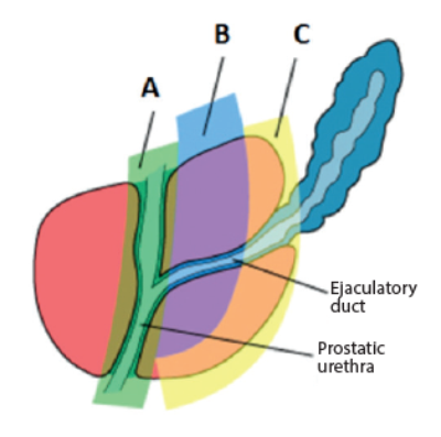 - Define the zonal anatomy of the prostate: A, B and C