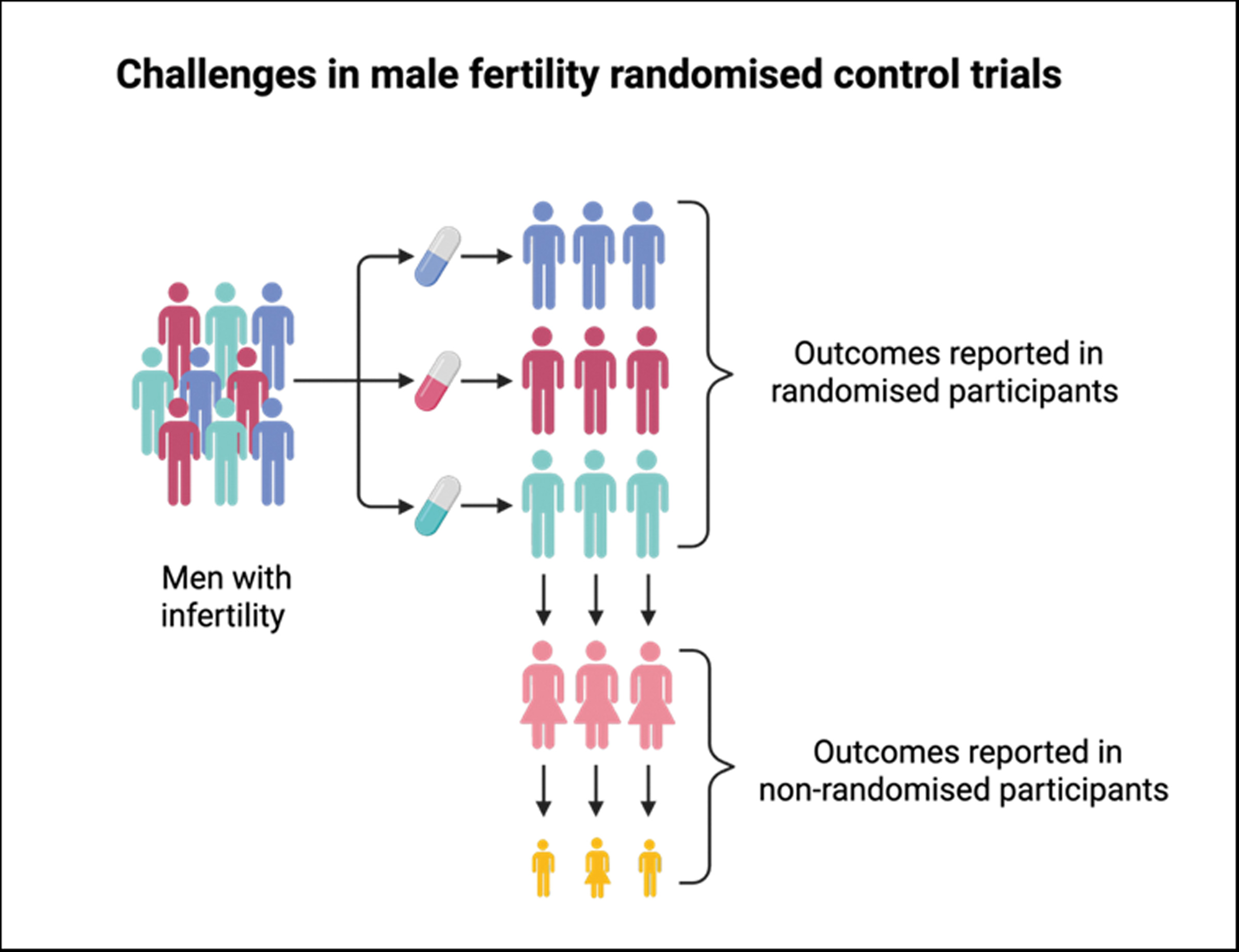 Typically, RCTs would involve a cohort of participants receiving an intervention or a placebo / standard care, with a robust and reproducible tool to measure a pre-defined outcome. These outcomes would usually be measured in the participants receiving the intervention. Infertility trials, in particular male infertility trials, are unique however, in that they have up to three potential participants whose clinical outcomes may be influenced by the intervention. These potential participants include a male participant, their female partner and their potential offspring (Figure 1).