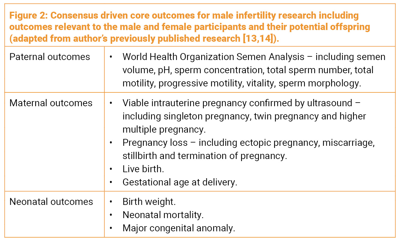 A recent systematic review of outcome reporting in the 100 largest randomised control trials in the last 10 years found significant heterogeneity [11]. Some of the examples of this heterogeneity include the nature of the intervention under study, including dietary supplements, surgical interventions and sperm selection techniques. Outcomes reported by these trials also varied with only 47 reporting a clear primary outcome, including semen quality, live birth and pregnancy rate, interestingly defined in 12 different ways or not at all.
