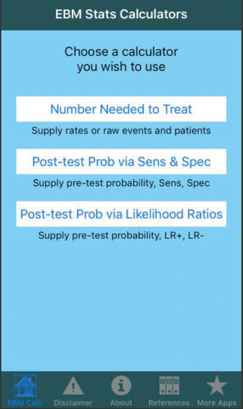 EBM Stats Calc is an app that aims to help physicians better quantify their decision-making processes. Clinicians can input likelihood ratios, sensitivity / specificity values, or raw data to calculate number needed to treat (NNT), post-test probability and positive / negative predictive value.