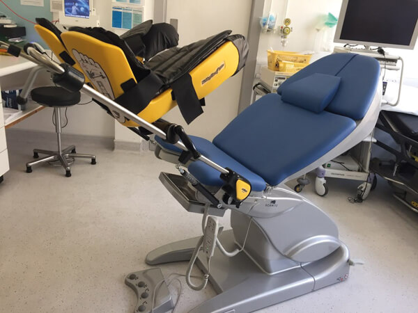 Our outpatient flexible cystoscopy room was adapted with an examination couch (chair model: arco with side rails, SCHMITZ u. Söhne GmbH & Co. KG) and stirrups (Figure 1). The level of personal protective equipment (PPE) was developed in accordance with guidelines from Public Health England and further adapted for performing TPPBx. The operating surgeon and assistant both wear a sessional gown, gloves, FFP3 mask, and eye protection; alongside single use aprons and sterile gloves. The circulating nurse dons sessional eye protection and fluid resistant mask with disposable gloves and apron. The patient is provided with a surgical face mask if they have not brought their own face covering. Donning and doffing areas were adapted to space availability and undertaken within the procedure room.