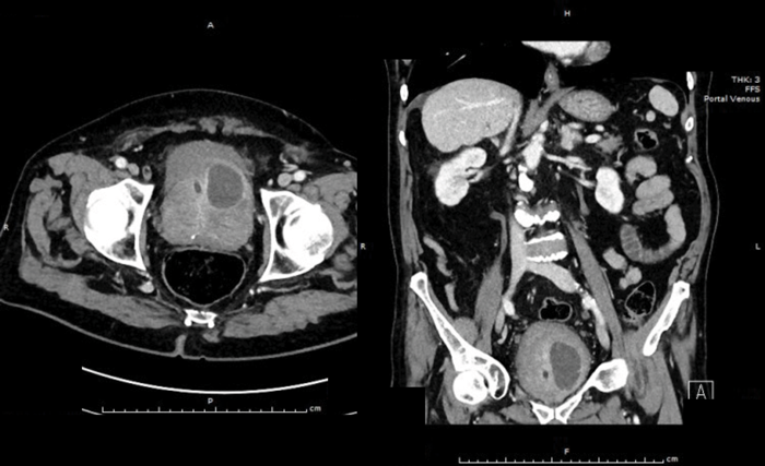 A 76-year-old diabetic man with a long-term catheter presents to the Emergency Department with rigors and non-specific abdominal pain. He has an elevated white cell count (WCC) and C-reactive protein (CRP). An abdominal and pelvic CT scan was arranged. Selected CT images are shown below: