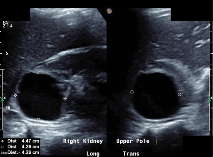 A well-defined cystic structure in the upper pole of the right kidney. The cystic structure had calcification within the wall. CT demonstrated a fluid density mass within the cyst, with an irregular coarse foci of wall calcification. There is a solitary gas locule within the superior aspect of the cyst.