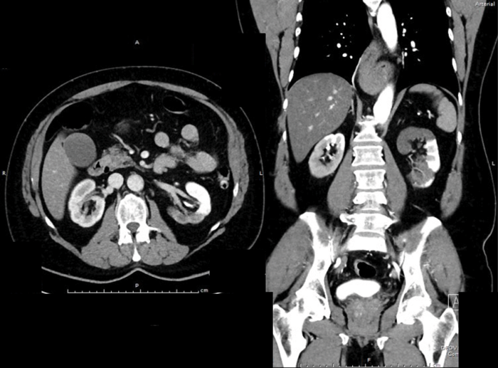 A 34-year-old lady is referred from the medics with right-sided loin pain and urosepsis. An initial ultrasound scan was arranged, followed by a subsequent CT scan. These scans did not show any renal / ureteric stone, but selected images are shown to the left.