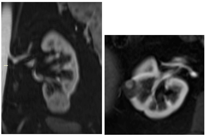 Figure 1: Incidental right indeterminate renal lesion on T2 weighted prostate MRI (left).