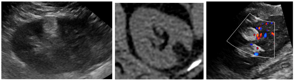 Figure 4: Mildly hyperechoic renal lesion on US (left).