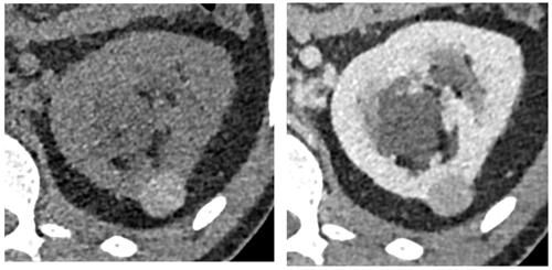An increase in attenuation (or enhancement gradient) of a lesion between unenhanced and nephrographic phase indicates the presence of solid vascularised tissue. It is however recognised that cysts can artefactually demonstrate pseudoenhancement (up to 10HU), the degree of which is influenced by factors such as cyst size, location related to renal parenchyma, beam hardening artefact and errors in image reconstruction algorithms [8]. A renal lesion that demonstrates an enhancement gradient <10HU is therefore considered insignificant, between 10-20HU is considered indeterminate and a gradient ≥20 HU is considered to represent definitive contrast enhancement consistent with RCC (Figure 5) [7].