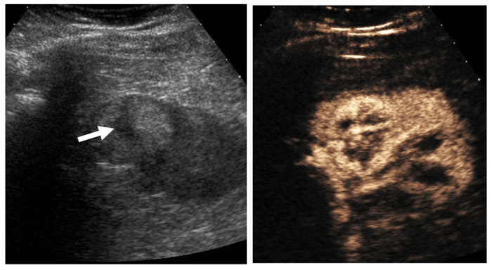 Avid enhancement following microbubble injection (right).