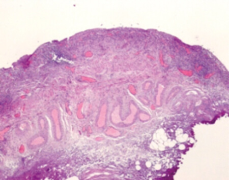 Figure 1: Urothelium demonstrating denudation of the GAG layer and infiltration with inflammatory cells.