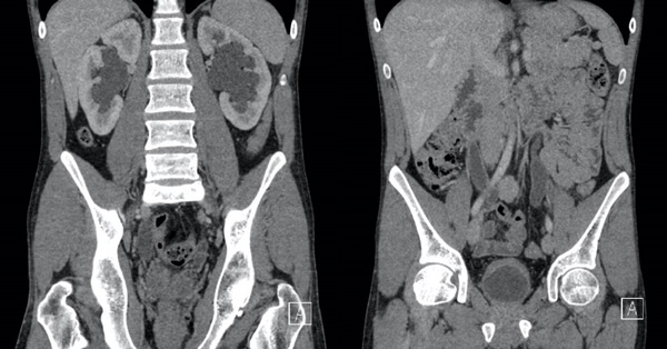 Figure 1: Coronal contrast CT images of a 23-year-old male patient with a prolonged history of recreational ketamine use, which shows bladder and ureteric wall thickening with hydroureteronephrosis.