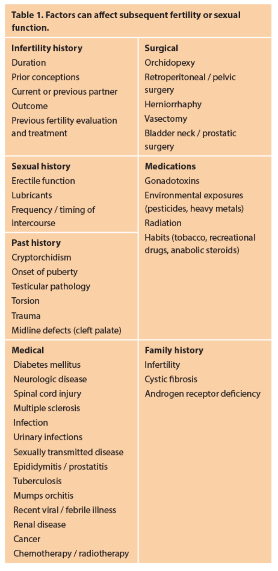 A thorough history is key in successful diagnosis of male infertility. Many specific factors can affect subsequent fertility or sexual function (Table 1).