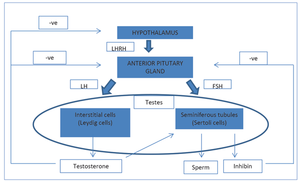 The hypothalamus secretes gonadotrophin-releasing hormone (GnRH). This causes the release of follicle stimulating hormone (FSH) and luteinising hormone (LH) from the anterior pituitary gland, which act on the testis. LH acts on Leydig cells to produce testosterone. FSH stimulates the seminiferous tubules to secrete inhibin and produce sperm.