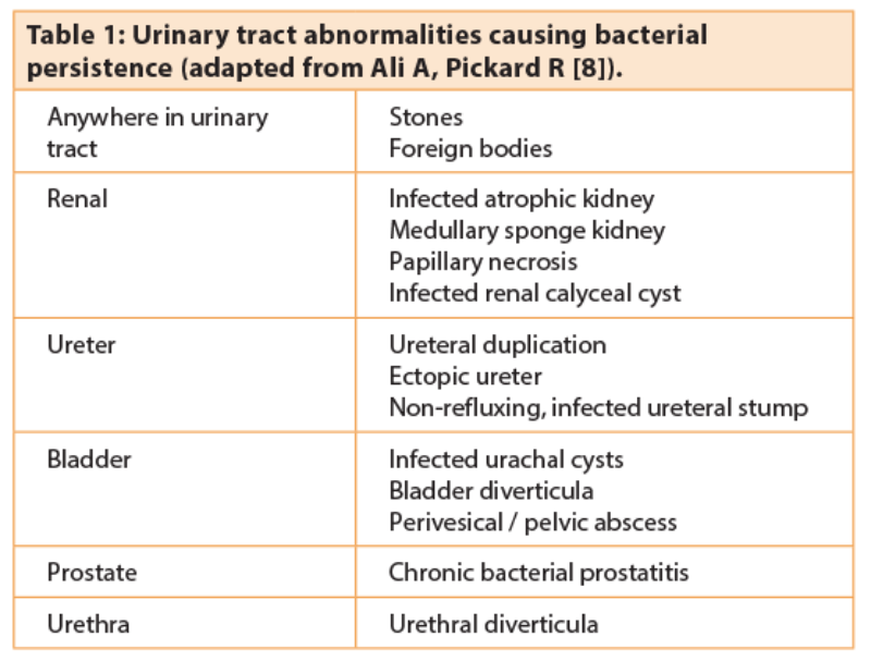 Once acute cystitis has resolved and there is no further microbiological evidence of bacteriuria, it is possible under certain circumstances for the organism to ‘hide’ within a part of the urinary tract which was exposed to less high concentrations of antimicrobial chemotherapy. The specific abnormalities that can result in this situation are outlined in Table 1 [8]. Urinary culture can be particularly useful in identifying bacterial persistence e.g. due to Proteus mirabilis, the commonest organism linked with the presence of infection stones. P. mirabilis can cause significant alkalinisation of the urine with precipitation of calcium, magnesium, ammonium, and phosphate salts and the subsequent formation of branched struvite (triple phosphate) renal stones. This has serious consequences as bacteria can persist inside struvite stones even when the urine shows no growth. Consequently, struvite infection stones are the major cause of bacterial persistence in women.