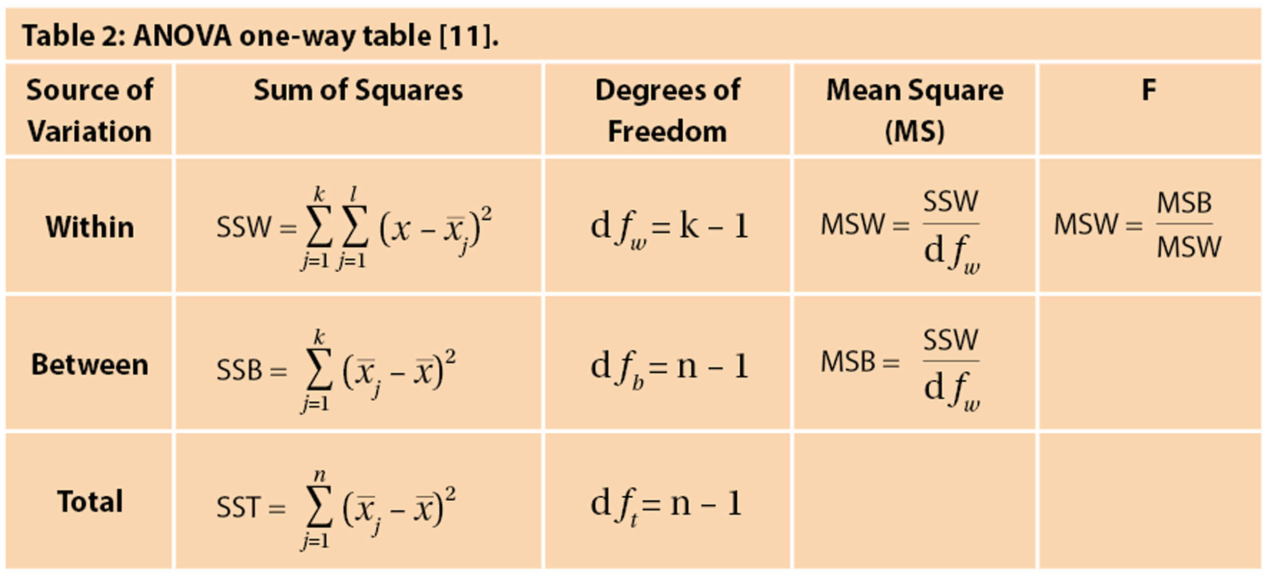 Although practical, t-tests can only be used to compare two groups of data. However where there are greater than two groups of data, analysis of variance (ANOVA) testing can be useful and provide a solution to comparing larger groups of data that are all independent [10]. ANOVA analyses differences between the group averages through the use of the variances. Table 2 below represents what a standard ANOVA one-way table looks like, with each of the relevant formulas stated. Although this looks very daunting at first, breaking it down into each separate element makes it easier to understand.