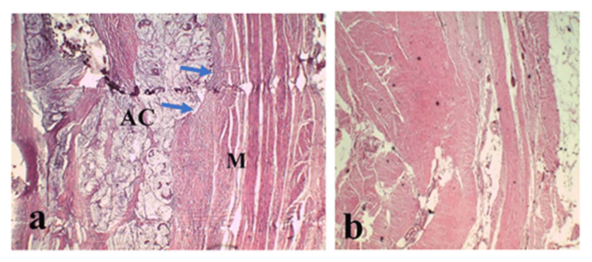 - Adenocarcinoma of the bladder is rare and accounts for 0.5-2.0% of all malignant bladder tumours [4]. Figure 3 demonstrates: a) primary adenocarcinoma (AC) and infiltrated muscle layer (M) (blue arrows) and b) tumour free urachus. Risk factors include bowel augmentation / bladder substitution into the urinary tract, schistosomiasis, chronic inflammation, exstrophy and can be associated with patent urachal remnant [5].