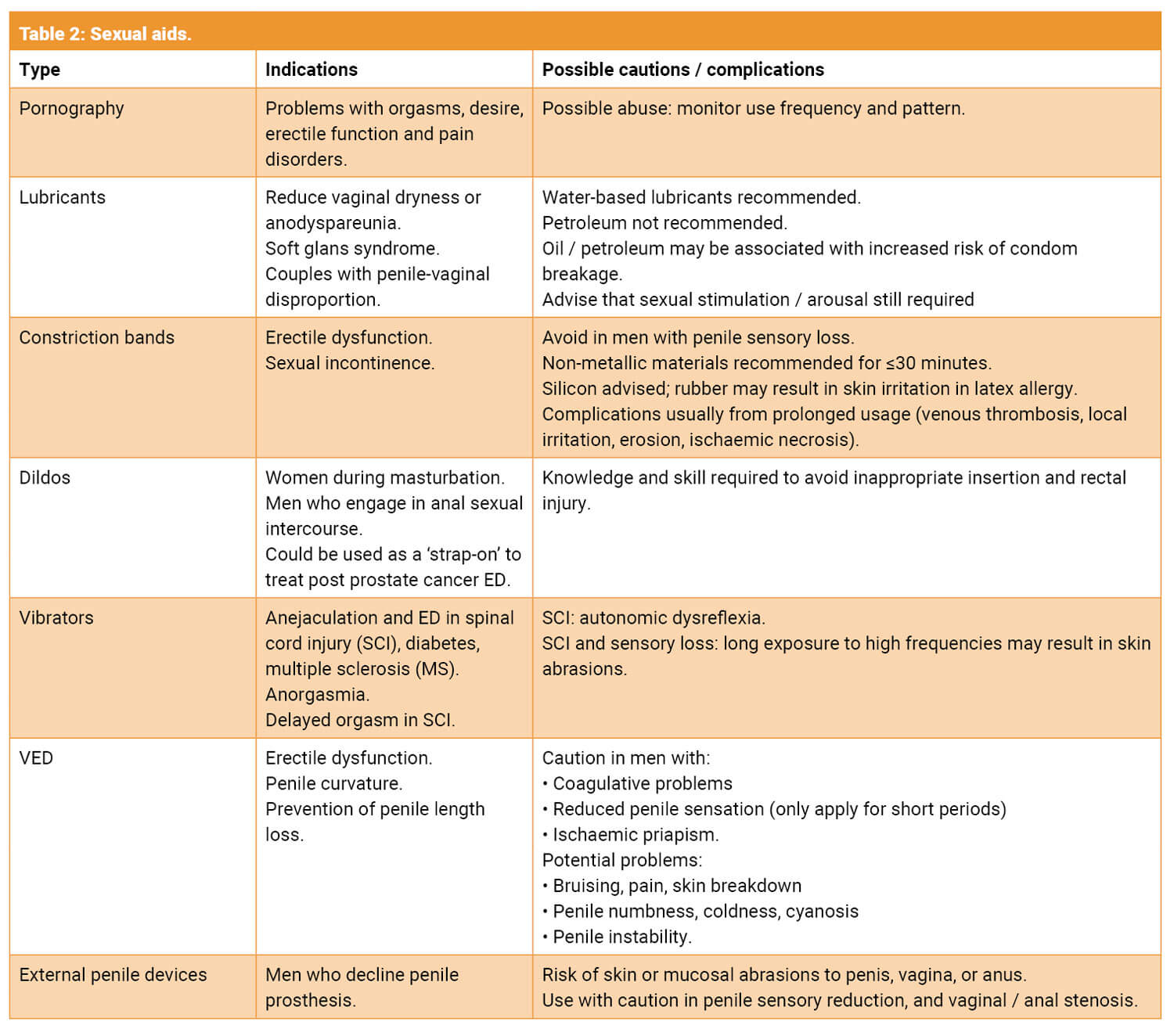 Sexual aids are any objects / devices which may be used to facilitate or enhance human sexual pleasure or function [11]. There are a wide range of these devices now available for patients to purchase on the internet or in specialist shops. In addition, some are now being used medically for sexual dysfunction i.e. vacuum erection device (VED). It’s important to broach this topic with sensitivity as some patients may find it unacceptable due to religious, cultural or relationship beliefs. Table 2 illustrates the main types of devices, their indications, and possible complications [11].