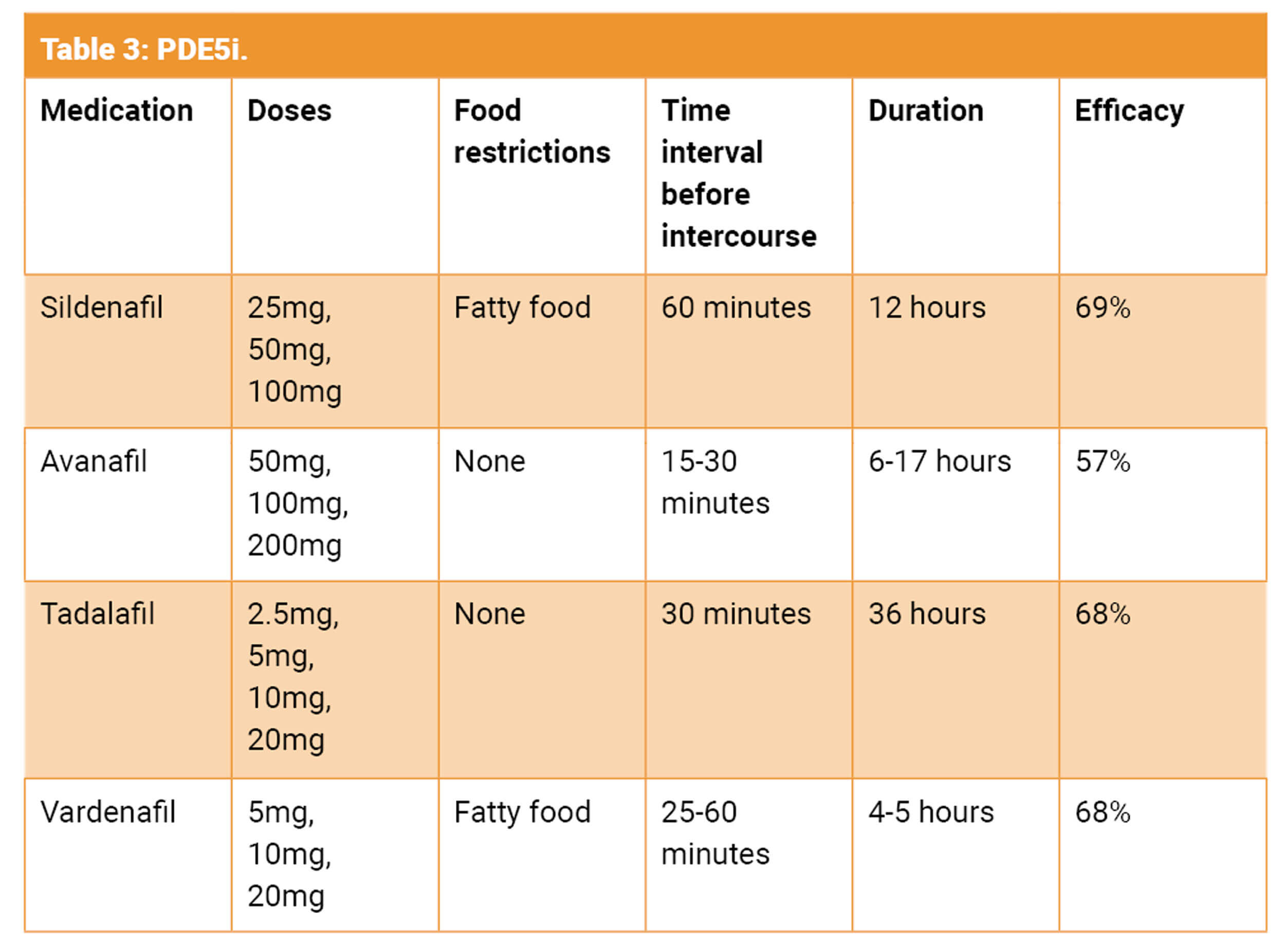 - Avoidance of use with fatty food with sildenafil and vardenafil.