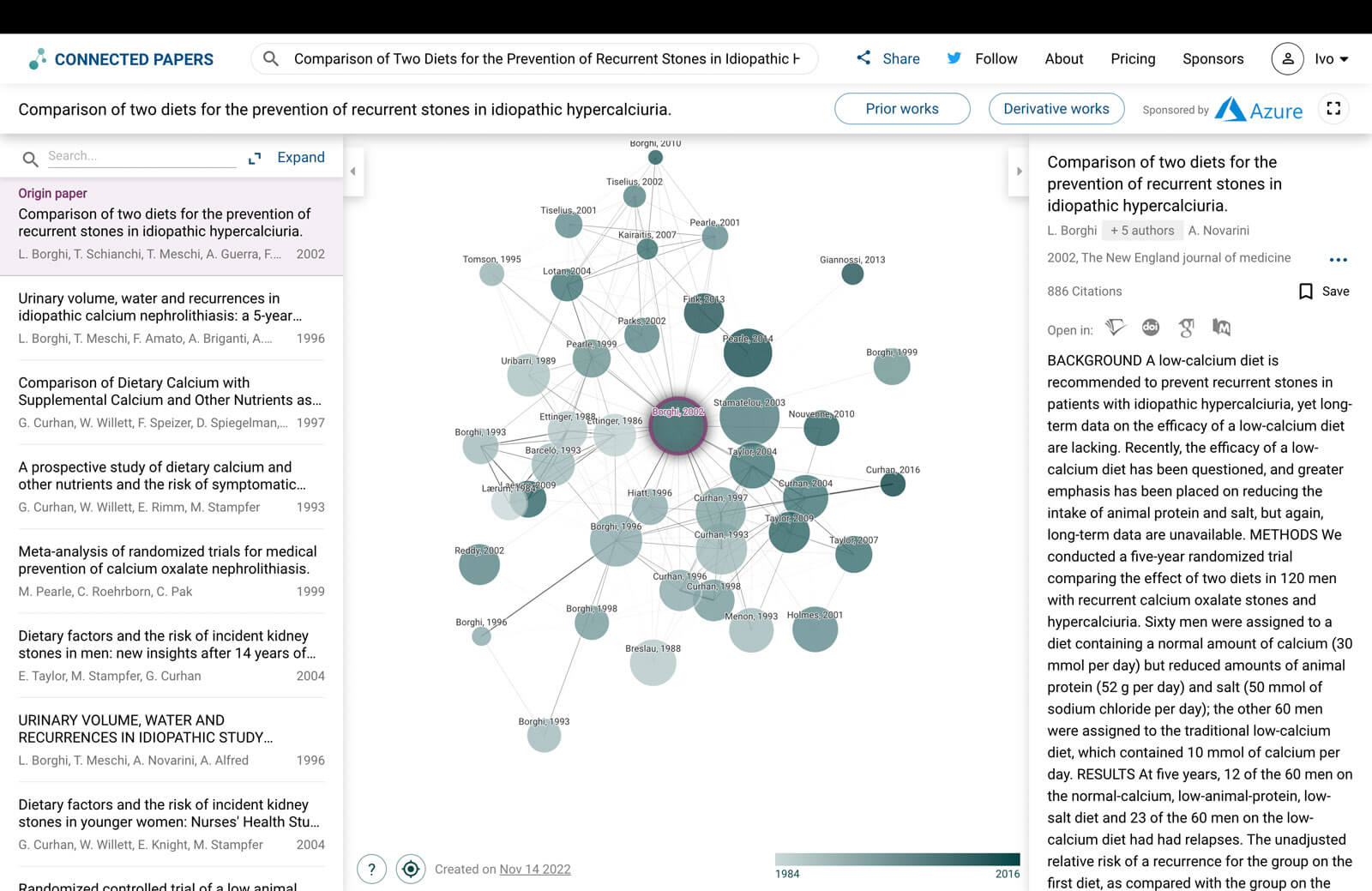 Building on the Semantic Scholar database, Connected Papers provides a visualisation of a field of study. You start by selecting a key paper and a visual representation of the field and related papers are created. By selecting each visual representation of a paper (a circle) an abstract (where available) is displayed on the right-hand side. The related papers are also displayed on the left side in citation number order. The selections and searches can be saved. Free searches are limited to five per month, and are unlimited at $3 per month.
