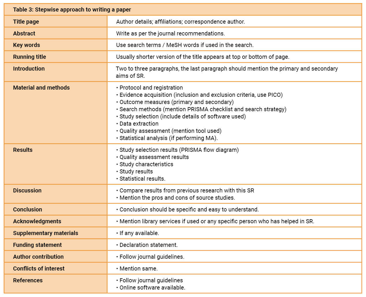 Once all this is ready, it is time to write the initial draft. The paper should be written either by keeping in focus on a particular journal or being flexible in terms of which journal it would be submitted to for publication. If authors consider a particular journal, it may be worth contacting the editorial team first as some journals entertain only invited reviews. Table 3 is a useful guide to writing the paper. At this stage, the PRISMA checklist should be completed.