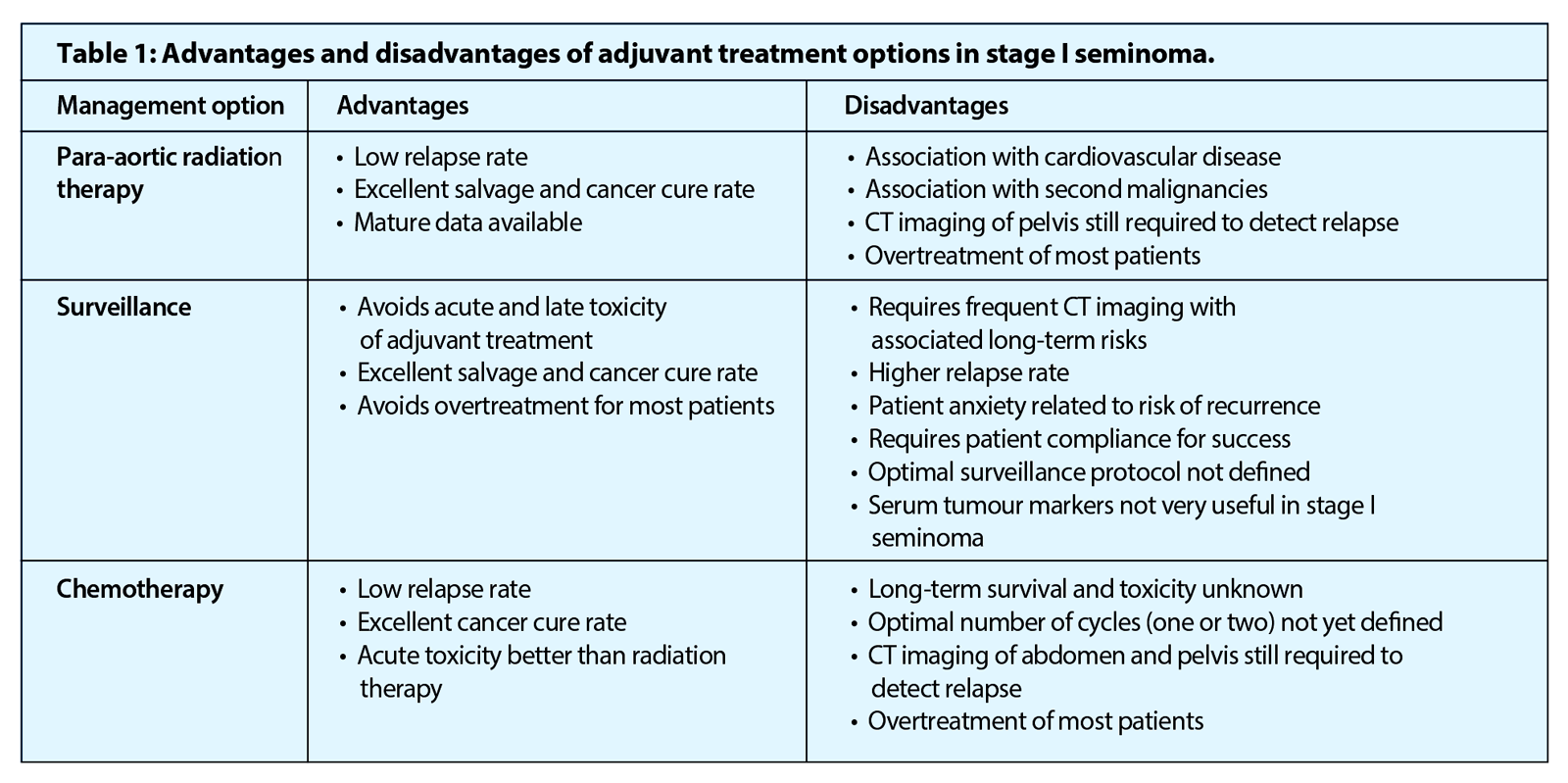 Testicular cancer is the most frequently occurring solid tumour in men between the ages of 15 and 34 years [1]. About 60% of cases are seminomas and approximately 70-80% of them have, at presentation, clinical stage I disease. This article will focus on the current treatment recommendations for stage I seminoma only.