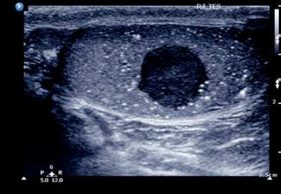 Right-sided testicular mass with associated microlithiasis.