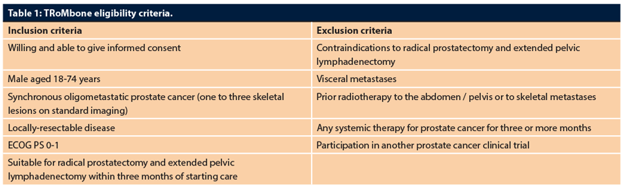 Therefore, there is an urgent unmet need for a randomised controlled trial examining the impact of surgery in men with newly-diagnosed oligometastatic prostate cancer. ‘Testing Radical prostatectomy in men with prostate cancer and oligoMetastases to the bone: a randomised controlled feasibility study’ (TRoMbone) aims to randomise 50 men to standard-of-care (ADT with / without docetaxel) versus standard-of-care plus radical prostatectomy with extended pelvic lymphadenectomy. All modalities of surgery (open, laparoscopic, and robotic) are allowed and a quality assurance programme is built in, mandating only one surgeon per centre perform these cases, evidence of >100 cases performed prior to the study, and a median lymph node yield >10 nodes using a standardised templated dissection (common iliacs, external iliacs, internal iliacs, obturators, fossae of Marcille).