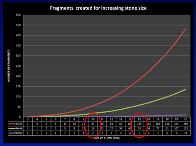 The mathematics helps explain the transition from ESWL for stones less than 10mm (where a sufficiently small number of fragments could pass spontaneously) through FURS for stones between 10-20mm, to PCNL for stones of 20mm and beyond (where spontaneous passage of nearly 300 three-millimetre fragments, or retrieval of 125 four-millimetre fragments via an access sheath make ESWL and FURS less attractive).