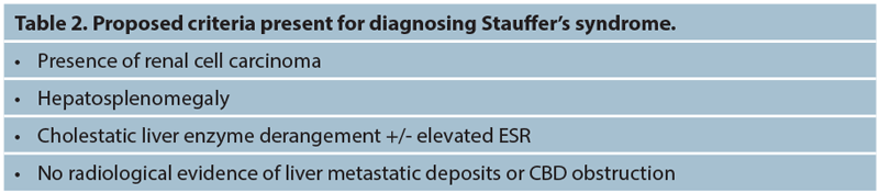 The abnormalities Stauffer described were renal cell carcinoma with associated hepatosplenomegaly and deranged liver function. The liver enzyme results showed a cholestatic picture with an elevated bilirubin, alkaline phosphatase (ALP), alpha-2-globulin and gamma-glutamyl transferase (GGT) as well as an elevated erythrocyte sedimentation rate (ESR) and a prolonged prothrombin time (PT).