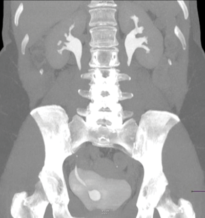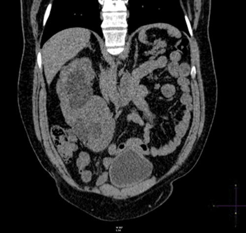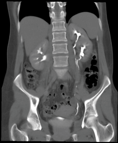Plain coronal CT kidney, ureter, bladder (KUB) demonstrating crossed fusion renal ectopia; one case in 1000.