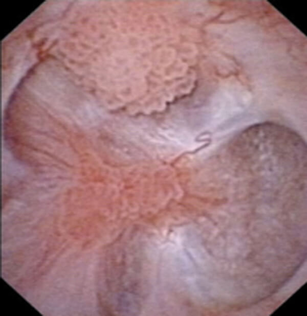 The same patient underwent a diagnostic ureteroscopy, with the following image seen during the procedure.