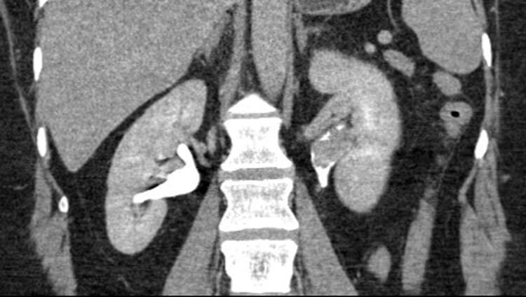 A 64-year-old man presents to the haematuria clinic with visible haematuria, on a background of a 40 pack-year smoking history and family history of bowel cancer in his sister at the age of 48. A CT was performed as part of his investigations (Figure 1).