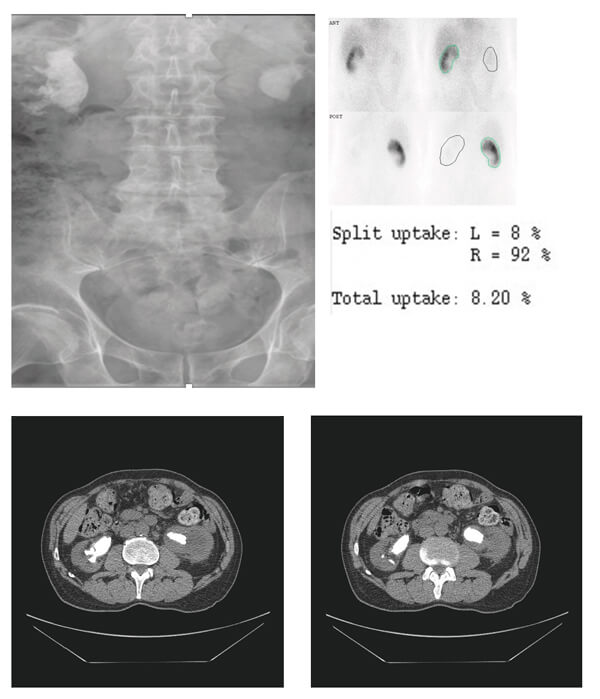 This is a DMSA scan showing a significantly reduced contribution from the left kidney (8% compared to 92% on the right). The right kidney should be treated first.