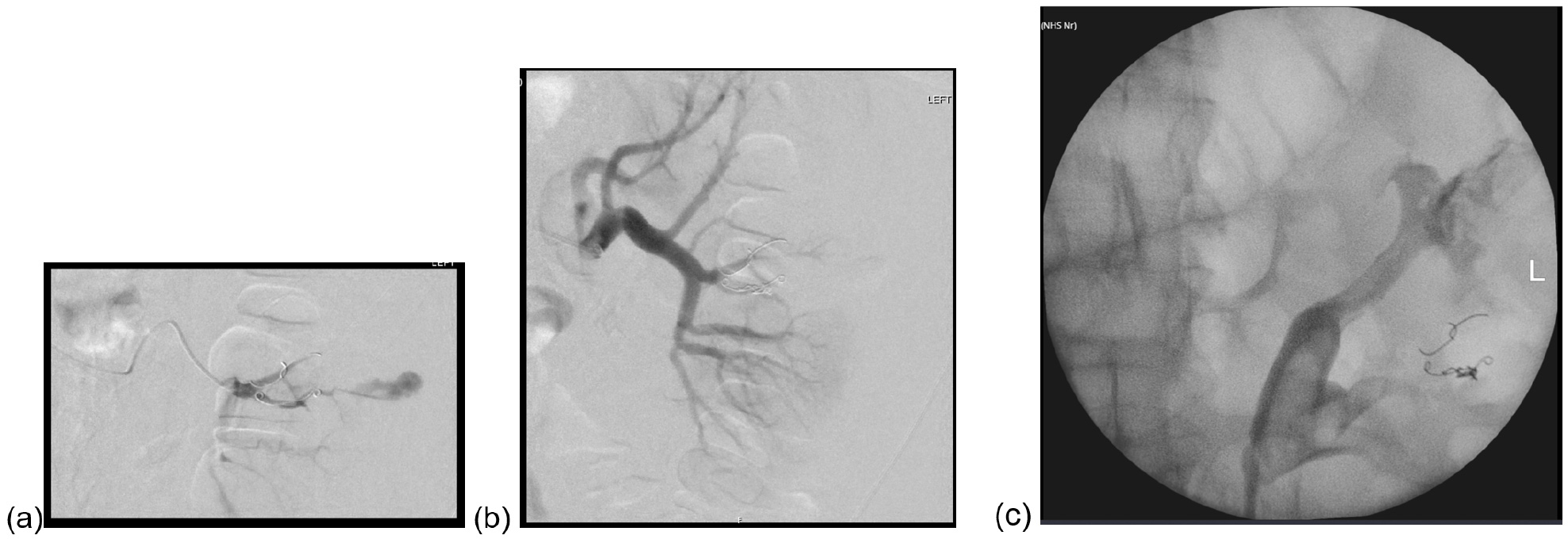 Figure 4: Pre- and post- repeat angioembolisation (a, b) and retrograde showing leak at upper pole (c).