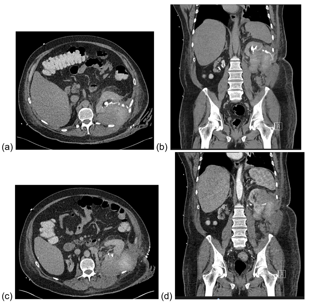 Figure 3: CT (axial and coronal) showing urinoma (a, b) + persisting pseudoaneurysm (c, d).