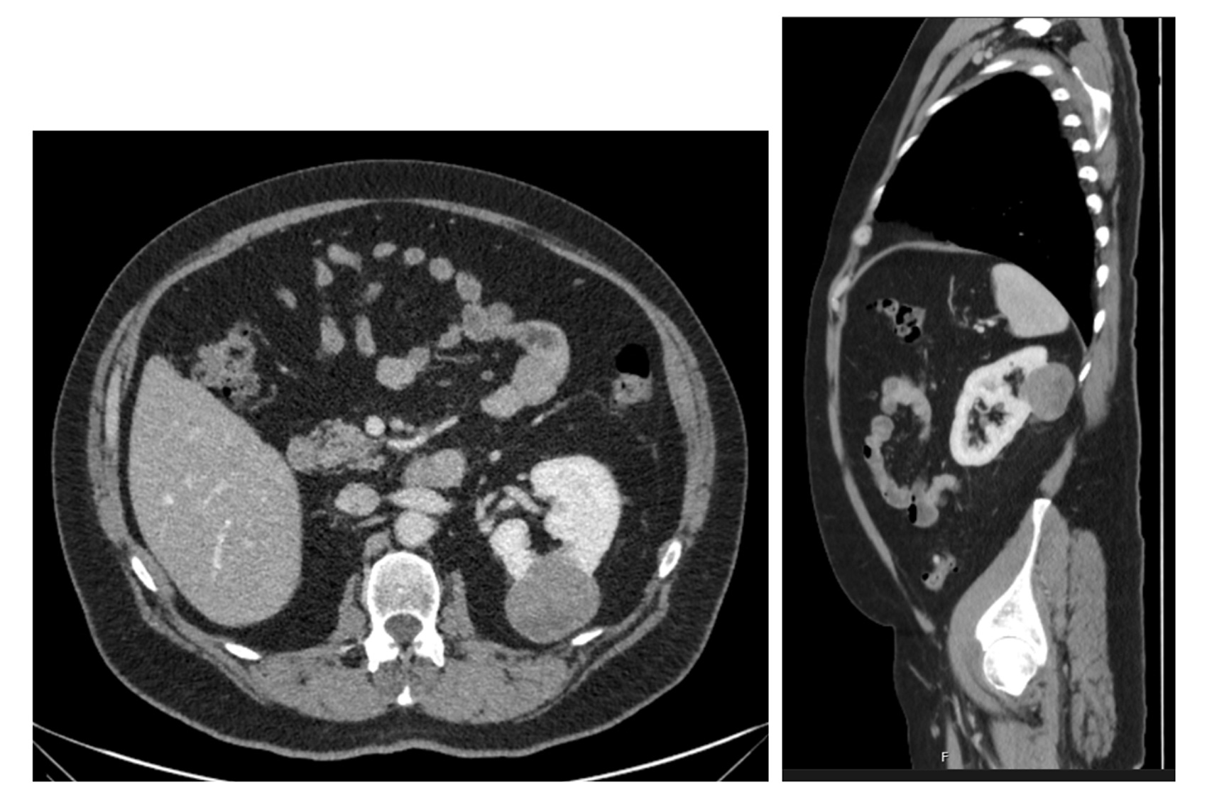 Figure 1: CT (axial and sagittal) views of the renal mass.