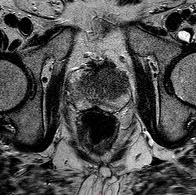 Although MR is most accurate in the detection of peripheral zone tumours, central / transitional zone tumours should also be actively considered, especially in patients with rising PSA and multiple negative transrectal biopsies [2]. Given the commonly heterogeneous appearance of the central gland, MR interpretation may be difficult, but the presence of the following may aid diagnosis: homogenous low signal intensity in the central zone (especially in the absence of an obvious peripheral zone tumour), poorly defined or speculated margins, absence or interruption of the low-signal pseudocapsule or urethral invasion (Figure 4) [2].
