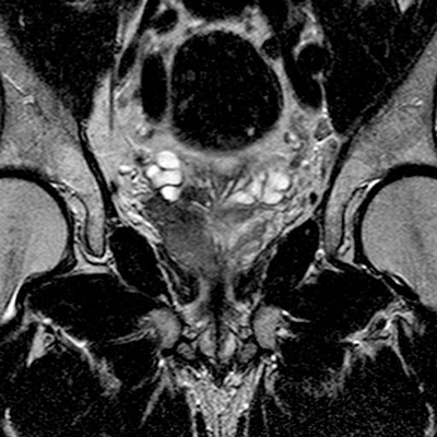 Large FOV axial T1W images are most useful for identifying local adenopathy. Criteria similar to those used in CT staging are often applied to MR to define clinically significant nodal involvement. Enlarged, spherical lymph nodes measuring at least 1cm in short axis dimension with loss of normal internal architecture are considered significant (Figure 7). Large FOV multiplanar T2W images of the abdomen and pelvis may be acquired to look for distant nodal disease or distant organ involvement. This is used in conjunction with CT, particularly in stage III or IV disease and when considering pre-treatment lymph node sampling [7]. T1 images should be evaluated to assess for bone metastases and will be seen as low signal intensity compared with the normal high signal marrow fat.